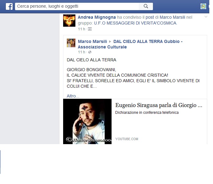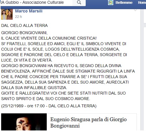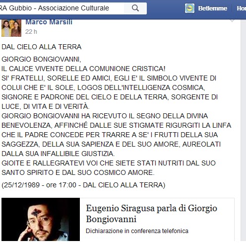 La base de la veracidad de lo que digo, existe y se basa en el HECHO, indiscutible, que no EXISTE NINGÚN ARREPENTIMIENTO por los errores cometidos contra el que fue el Padre Espiritual Eugenio Siragusa y en la interpretación de su obra. Deliberadamente, la elección de Giorgio Bongiovanni fue seguir y de hacer su propia cosa, cada uno frente a esta elección, finalmente decidió asumir sus responsabilidades.