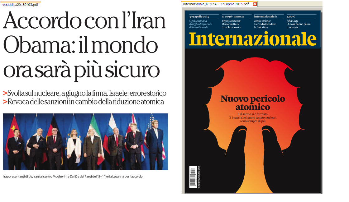 http://tg24.sky.it/tg24/mondo/2015/04/02/nucleare_iran_accordo_storico_obama.htmlNuclear Iran, acuerdo histórico. Obama: “Mundo más seguro» Mogherini «…Naturaleza pacifica del programa…» http://www.ilcambiamento.it/guerre/escalation_nucleare.html La escalada nuclear detrás de la retórica política