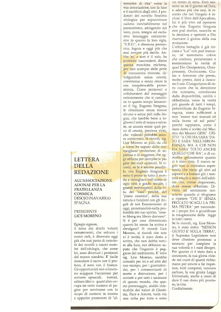 –Después de todas estas historias, Eugenio por directivas, me pone a la atención de publicar dos cartas en el periódico «Nonsiamosoli en el 1987», en las cuales se aclara la posición de cómo son determinados personajes inherente al tema de la realidad extraterrestre, una es dirigida personalmente a Lice Moreno.