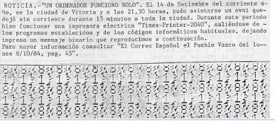 Carmelo hizo una demostración práctica. Desconectó el enchufe que alimenta el ordenador y la impresora e intentó reproducir el test en cuestión. Lógicamente, ni uno ni otra dieron señales de vida. -Como ves –comentó- si se va la luz esto no funciona. Pero hay más. Daubagna conectó los aparatos a la red y, una vez restablecido el suministro, pulsó las teclas de la impresora, siguiendo la consecuencia necesaria para que procediera a escribir los “ochos” y los “unos”. Primero la tecla de ‘Ion”. A continuación, de nuevo ‘Ion”, con el fin de que la impresora avance. Seguidamente las teclas de “on” y “off” de forma simultánea. Las mantuvo así por espacio de cuatro segundos, separando después el dedo de “off”, pero manteniendo la de ‘Ion”. Un segundo después, al retirar los dedos, la impresora empezaba a reproducir los citados “ochos” y “unos”. . -Para que la máquina escriba este test –concluyó Carmelo- es necesaria la manipulación que acabas de presenciar. No entiendo por tanto, cómo sin luz y sin.que pulsaran estas teclas pudo ponerse en marcha la impresora. Lo “escrito” de forma tan extraña por la referida impresora, contiene además, en opinión de su propietario, . otros “detalles” no menos desconcertantes. Por ejemplo: la impresora tiene fijados sus limites en un total de 32 caracteres por línea. Y en este “escrito” se contabilizan treinta y dos y medio. Los signos intermedios, situados entre los“ochos” y los “unos”, no están entre los programados. El microordenador, por supuesto, puede “fabricar” infinidad de caracteres a gusto del que lo maneja, pero nunca uno que no haya sido previamente programado. -Si fuera un fallo por sincronismo o cambio de velocidad –añadió Carmelo-, no se repetiría el mismo signo… -¿Qué crees entonces que ha podido suceder? Daubagna se encogió de hombros. -Ni idea. Esos signos, desde luego, tienen que responder a un cambio de valores en la impresora pero –y aquí está el problema-, ¿qué y cómo se ha hecho?” El misterio está ahí. En estos momentos, una serie de especialistas en ordenadores –repartidos entre el País Vasco, Madrid y Barcelona– tratan de descifrar el enigma y, sobre todo, los extraños caracteres aparecidos tan increíblemente en la impresora de este vecino de Vitoria. Y a uno, sin poder remediarlo, le viene a la mente una quizá remota posibilidad, pero posibilidad a fin de cuentas, hasta que no se demuestre lo contrario: ¿tuvo algo que ver ese ovni visto sobre la capital alavesa con esta impresora que “escribió sola”? Quizá las próximas investigaciones arrojen luz sobre este asunto. Desde aquí, por supuesto, invito a cuantos técnicos y especialistas en informática puedan examinar el presente documento a manifestar su opinión al respecto. ¿Qué significan el 1 y el ó del mensaje binario de la computadora?, escuchemos al propio Eugenio Siragusa: