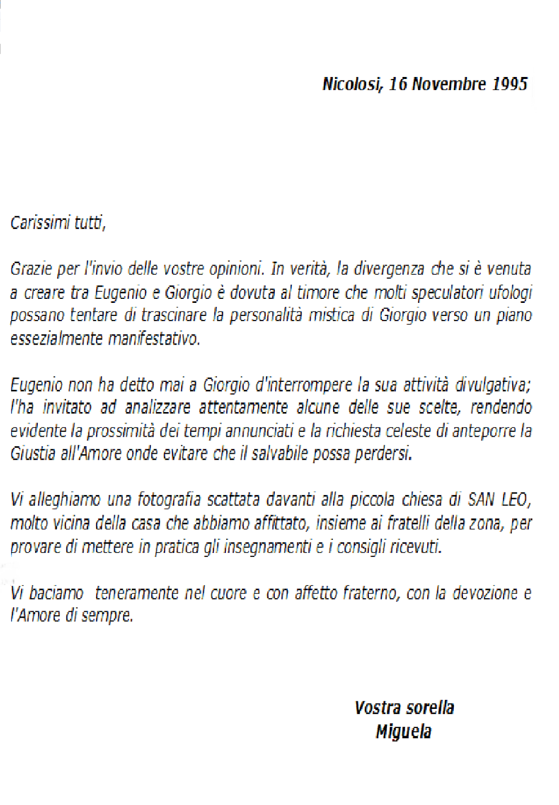 NO…!…NO…!…NO ES VERDAD…! Yo …NUNCA!…NUNCA!…NUNCA!!! ME HE RETIRADO...de la Testimonianza conferida en HONOR a la OBRA de Eugenio Siragusa… Me he retirado de Giorgio, y la he dejado INICIANDO 1998, CON LA SOLICITUD DE RESTITUCIÓN DE LOS SIMBOLOS DE EUGENIO y porque la metodología operativa NO REFLEJABA MÁS AQUELLA DEL CONSOLADOR PROMETIDO DE LA LUZ CREANTE ….. Precisamente como él ha dicho, Giorgio ha hecho su propio camino. El 09 de julio de 1992 Giorgio, Yo sin embargo el 12 de julio de 1992, existen documentos que lo prueban, nos hemos posicionado en direcciones distintas Yo en fé a la obediencia al querer de Mi Padre Espiritual vine a Sicilia, para el desarrollo del programa que había sido ya escrito y con grandísimo sacrificio y renuncia ,es Testigo el Cielo y la misma familia de Eugenio, son también AQUI en la TIERRA del SOL. Giorgio según él, había sido designado para andar por Sud América. Pero como sabemos, no se iría de inmediato como le había sido dicho, se iría más tarde y con modalidad completamente distinta. yo vine rápido a Sicilia y como quería el Cielo y en fé y obediencia. He realizado en mí, y como Eugenio ha siempre querido, un querer bien preciso. No he jamás realizado nade por voluntad mía…Giorgio dice claramente que ha HECHO, POR DECISIÓN SUYA y ha realizado las enseñanzas recibidas, como él ha querido, según su voluntad…. OBSTINADAMENTE…!!! El no ha querido más seguir aquello que la Virgen y Jesús le habían dicho, respecto de la personalidad espiritual de Eugenio Y EL PROGRAMA….